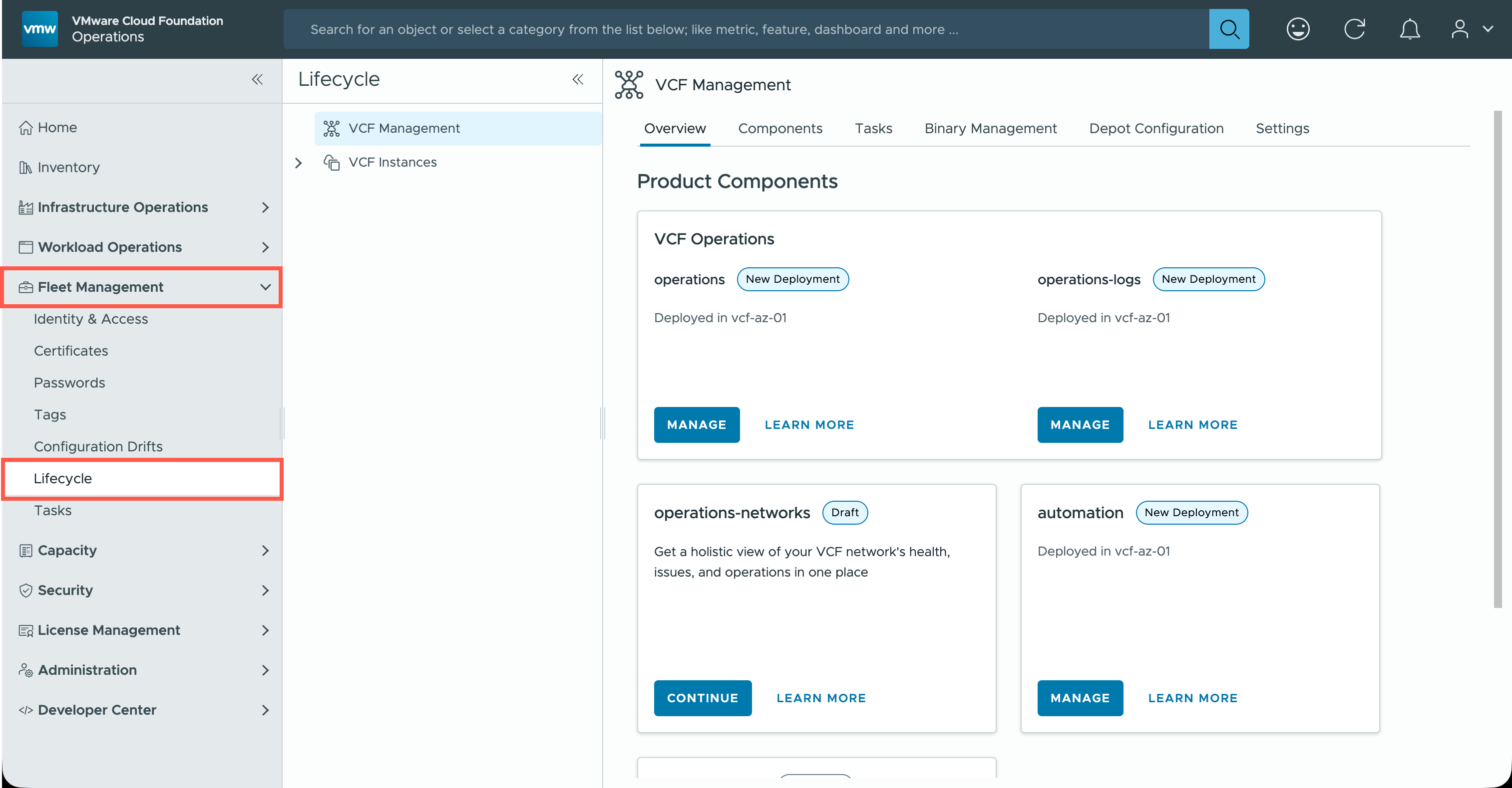 - From the VCF Operations Home page, click Fleet Management and then click Lifecycle.