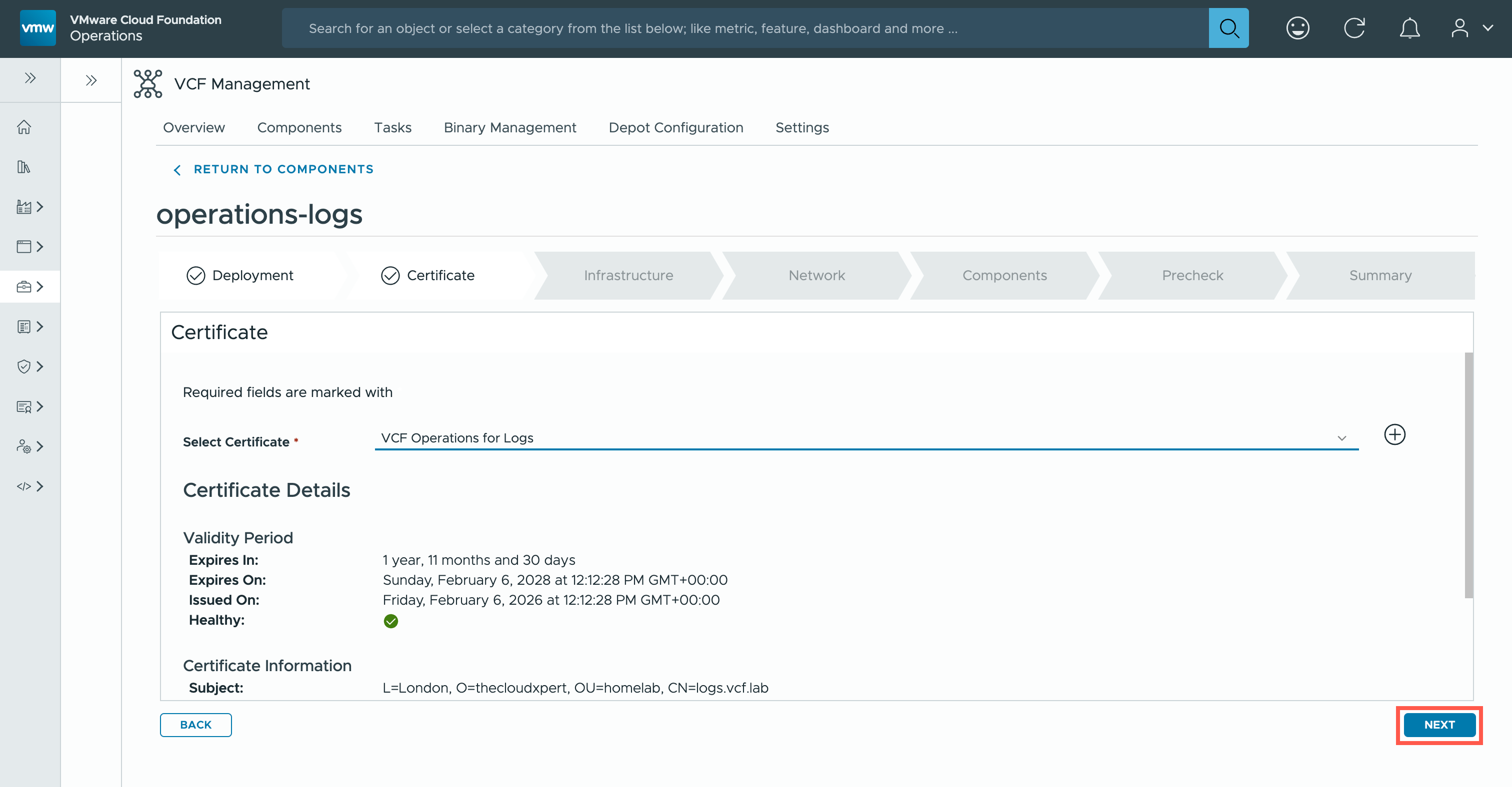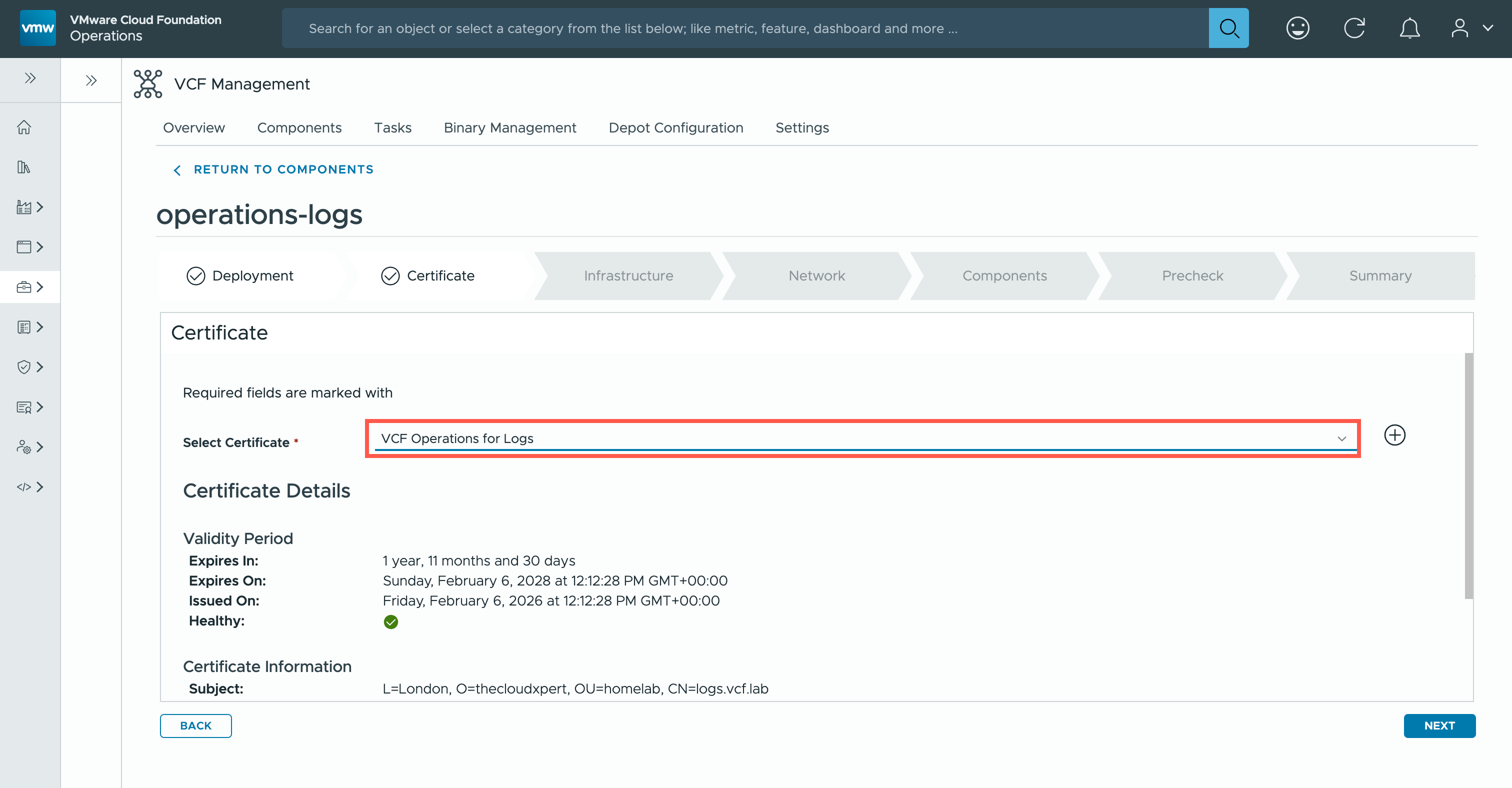 - At the Certificate page, select the Operations for Logs certificate from the dropdown of existing certificates.