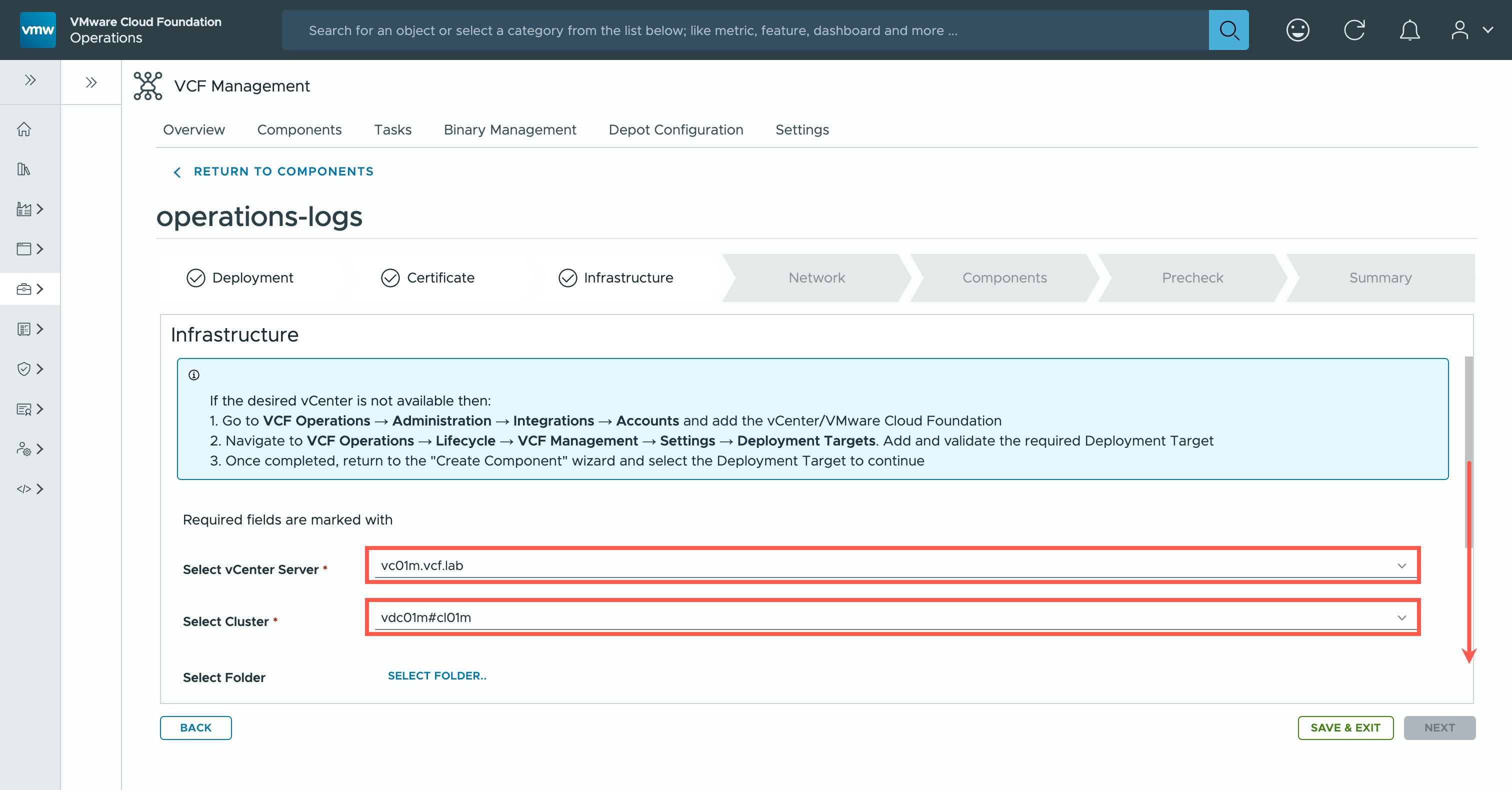 - At the Infrastructure page, select <vcenter.fqdn> from the Select vCenter Server dropdown, select the <target.cluster> from the Select Cluster dropdown and then scroll down.