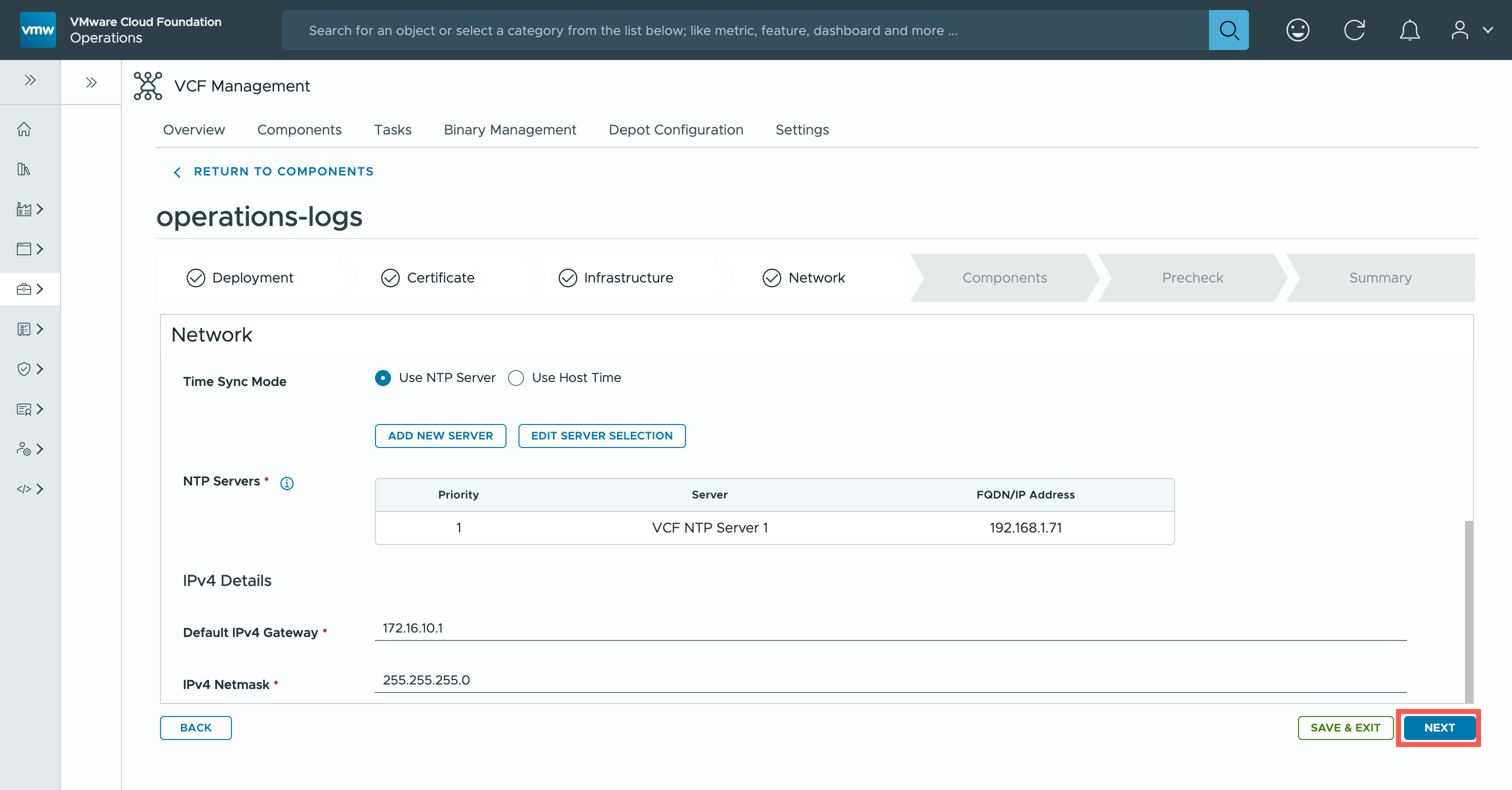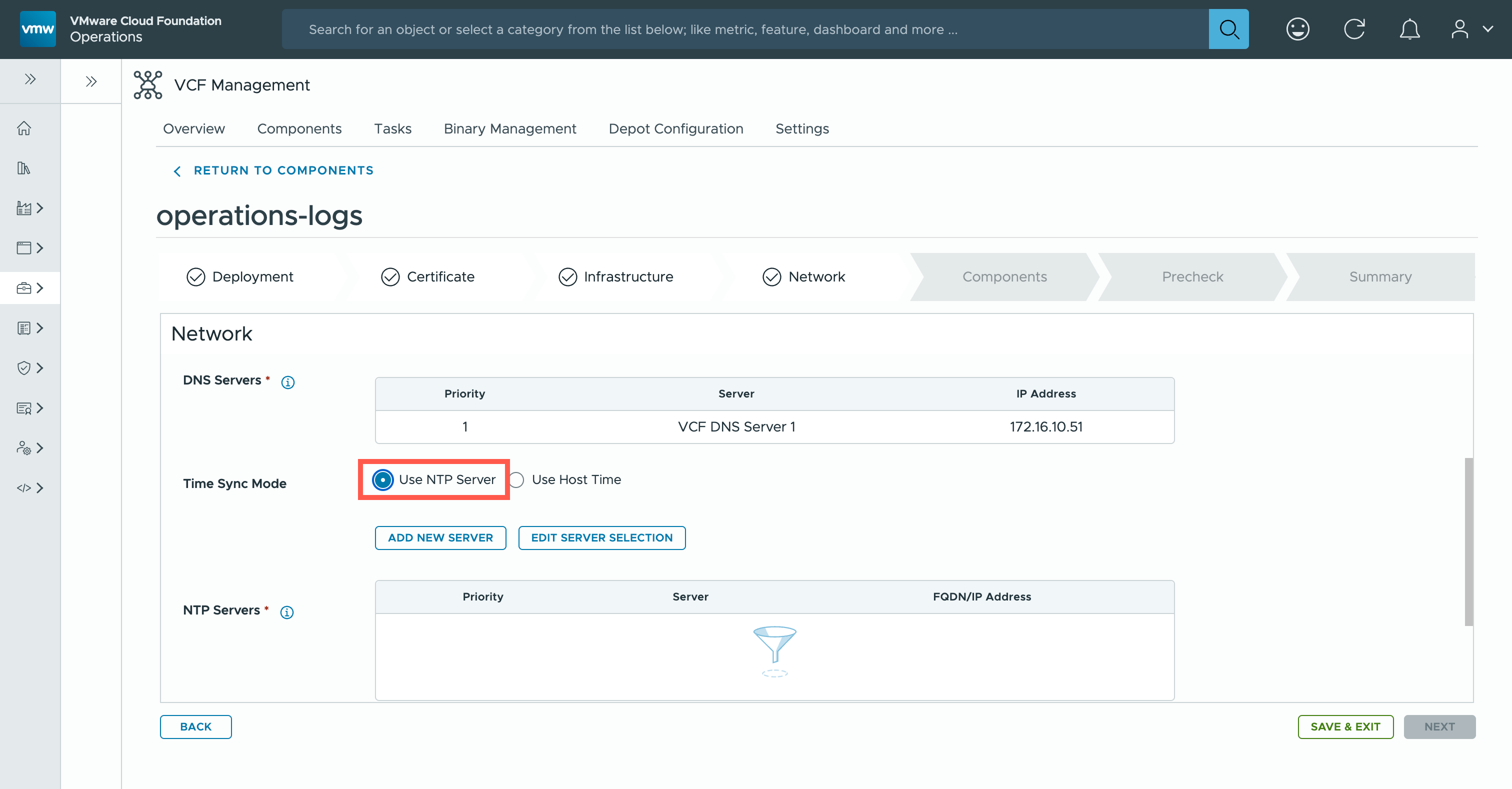 - At the Network page, scroll down and then, under the Time Sync Mode options, select the Use NTP Server option.