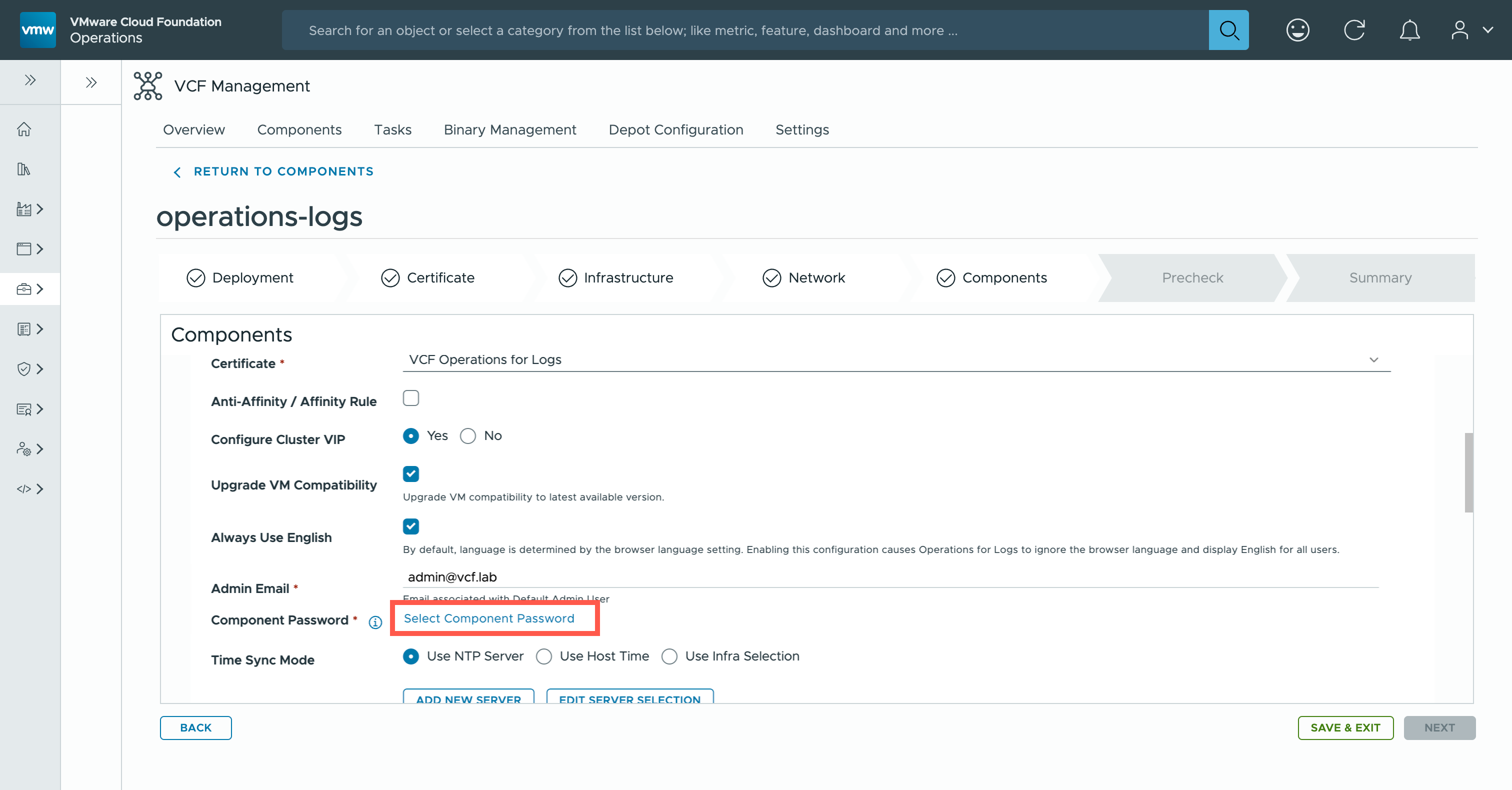> * Cluster VIP > * Upgrade VM Compatibility > * Always Use English These may differ across installations depending on requirements. - At the Components page, click Select Component Password.