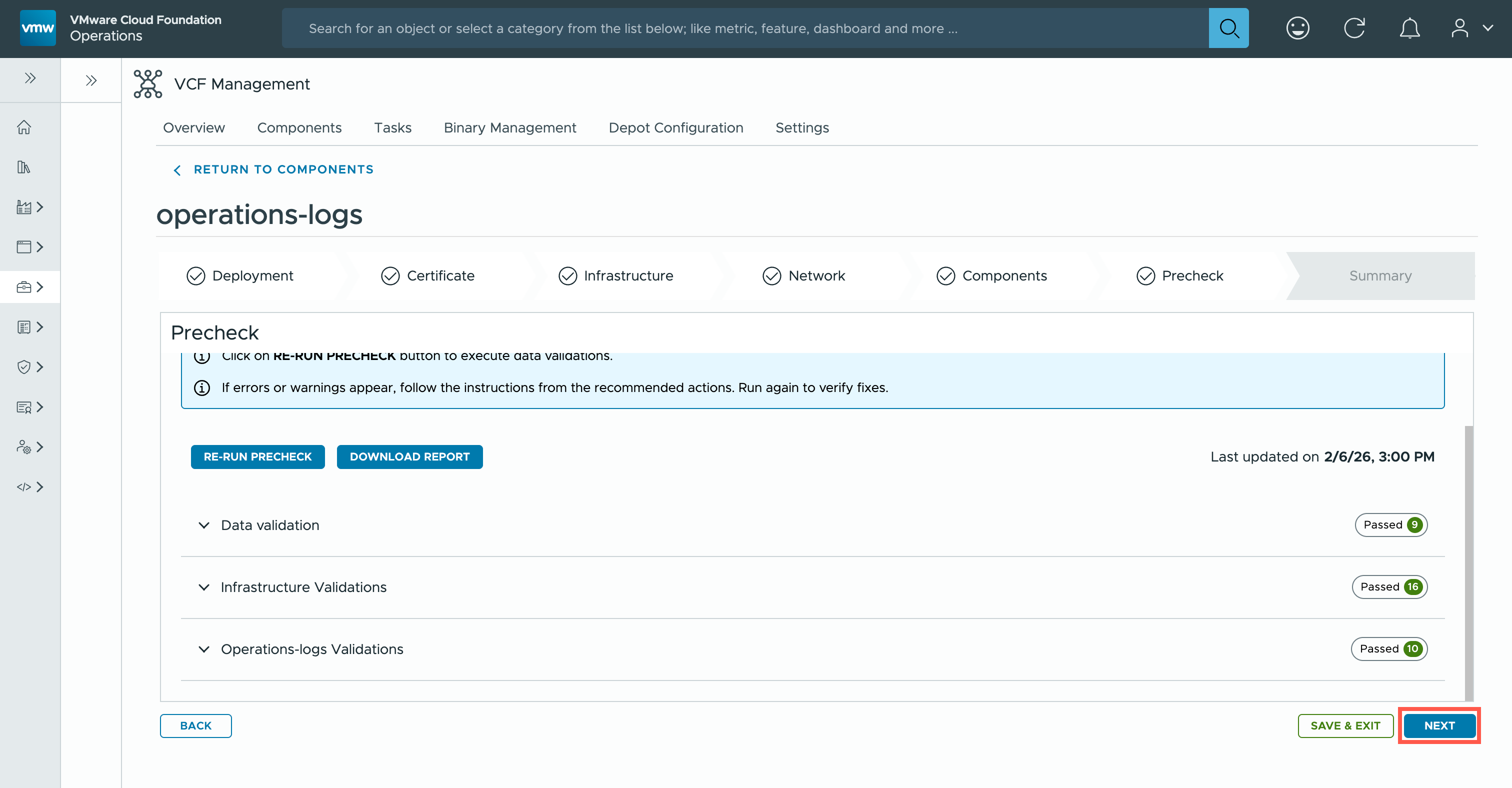 - At the Precheck page, assuming all pre-checks are passed, click NEXT.