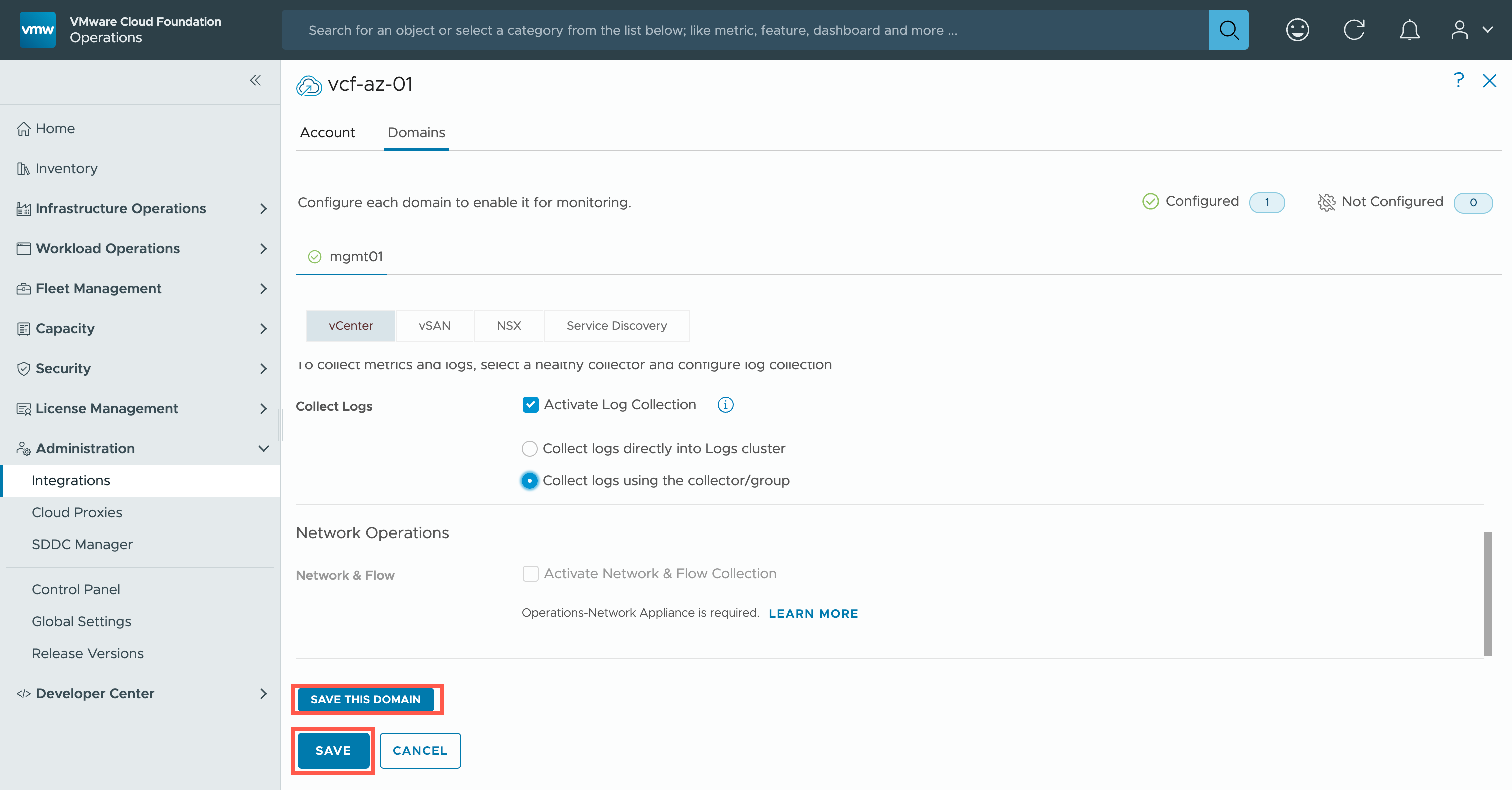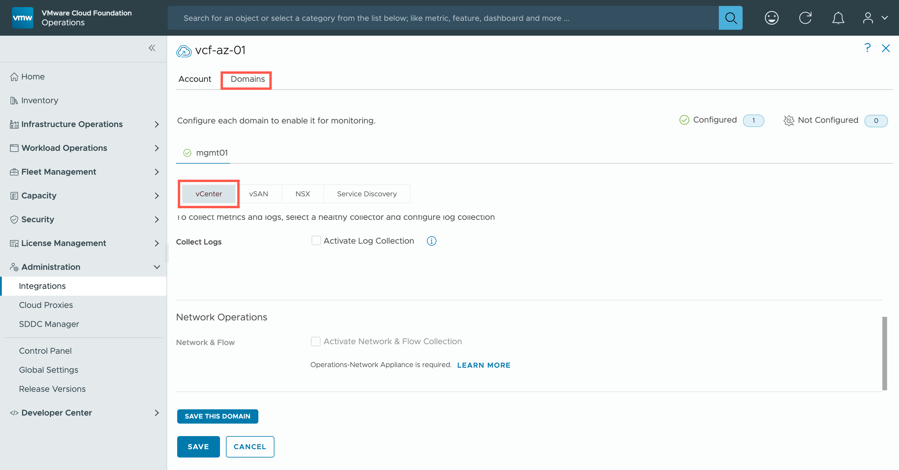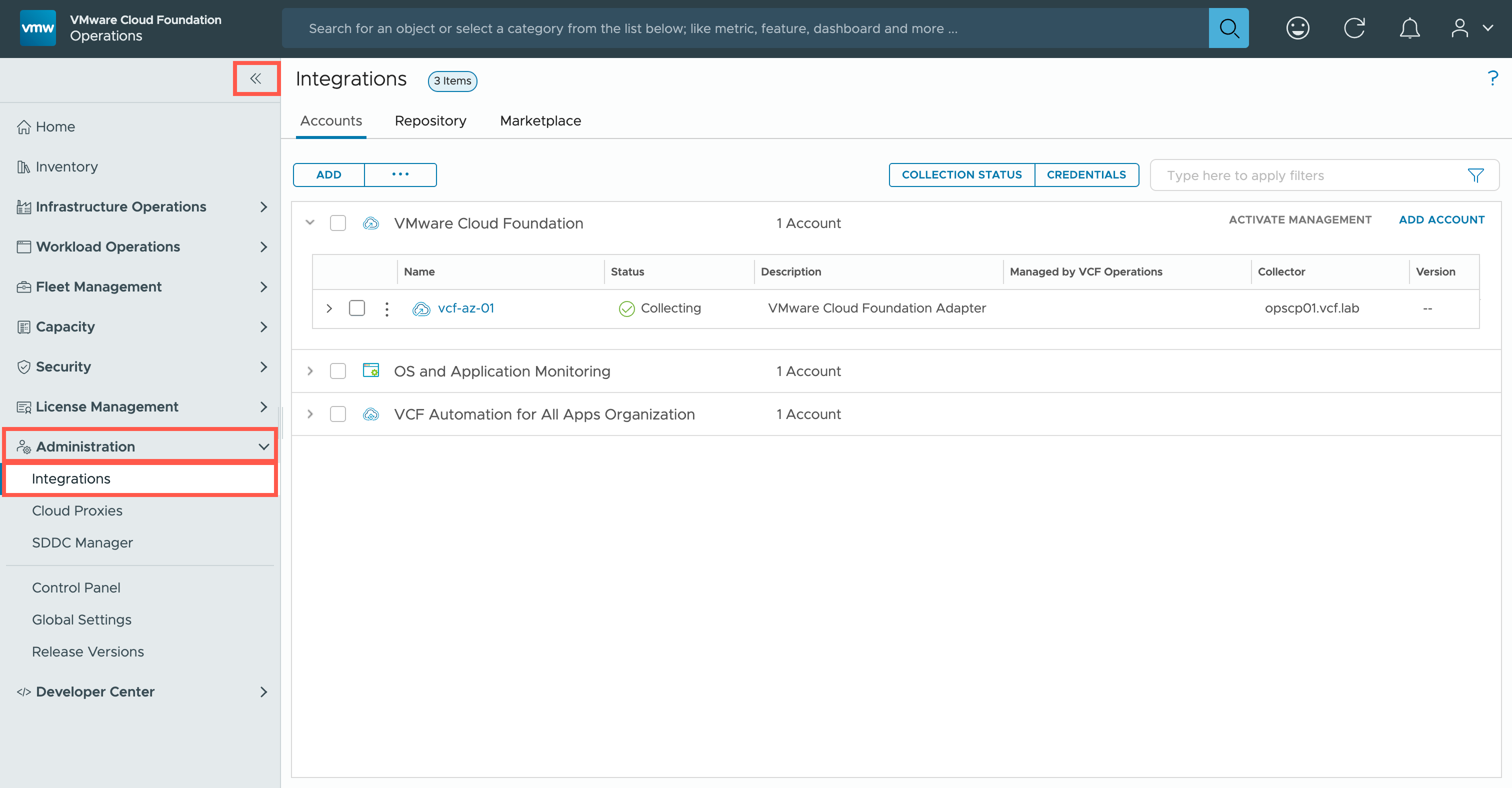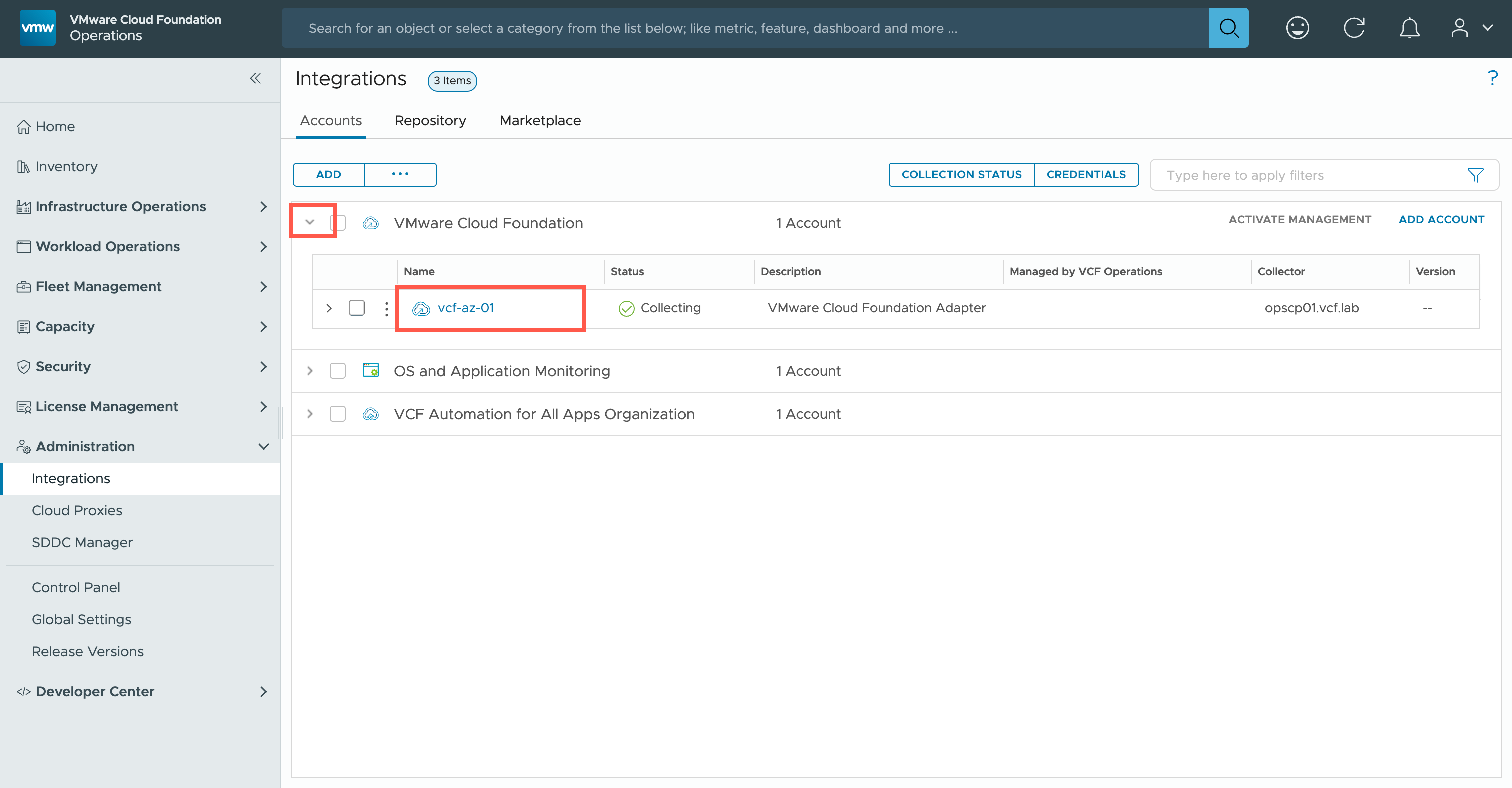 - At the Integrations page, expand VMware Cloud Foundation integrations by clicking > and then click